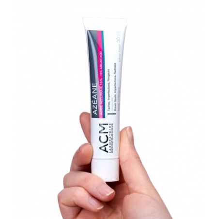 Acide Azélaique 15%La crème à l’acide azélaïque Azéane ravive l’éclat du teint et estompe les taches, les imperfections cutanées et les rougeurs pour une amélioration générale de la peau perçue dès 7 jours(1,2).Formule multi-actions 4-en-1 : hyperpigmentations, teint terne, imperfections, rougeursIdéal pour : “Tous les types de peau. Hyperpigmentations, teint terne, imperfections et défauts cutanés, rougeurs”Texture : CrèmeEstompe les taches brunes, unifie le teint, atténue les imperfections, diminue les rougeursTube 30 ml