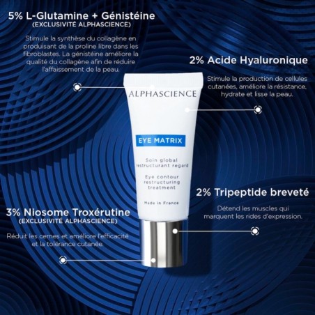 Le EYE MATRIX de Alphascience stimule la synthèse du collagène en produisant de la proline libre dans les fibroblastes. La génistéine améliore la qualité du collagène afin de réduire l’affaissement de la peau. Il Réduit les cernes et améliore l’efficacité et la tolérance cutanée.