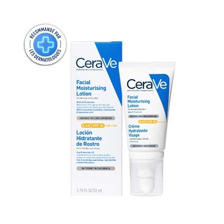 La Crème Hydratante Visage SPF30 de CeraVe est un soin qui hydrate les peaux normales à sèches.