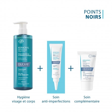 • Le gel moussant KERACNYL est un nettoyant visage & corps quotidien adapté pour l’hygiène des peaux grasses et/ou à tendance acnéique des adolescents comme des adultes