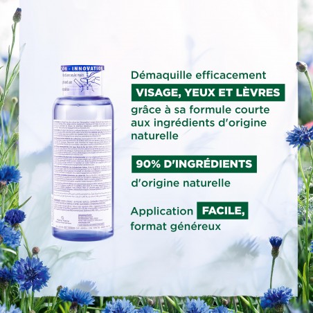 En sélectionnant le Bleuet issu de culture biologique, Klorane a formulé une Eau micellaire démaquillante naturelle*, spécifiquement adaptée aux yeux sensibles ou porteurs de lentilles. Sa composition minimaliste de 6 ingrédients démaquille efficacement le visage, les yeux, et les lèvres, laissant la peau nette, apaisée et douce au toucher. L’Eau micellaire démaquillante a été élaborée pour minimiser les risques de réaction allergique.