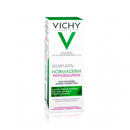 Pour remédier à ce problème cutané, les laboratoires Vichy ont développé Vichy Normaderm Phytosolution, un soin du visage quotidien qui possède une double correction. En effet, grâce à ses actifs dermatologiques anti-acné sélectionnés avec soin par la marque, ce soin agit sur deux niveaux :